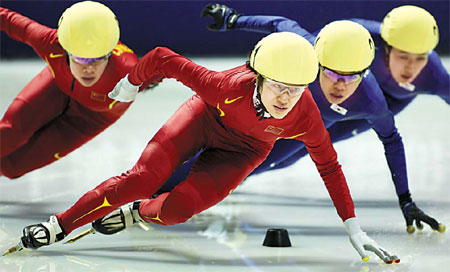 China's coaches regard these de facto world varsity games as a litmus test for the country's chances of breaking into the top ten on the medal table at next year's Vancouver Winter Games. If the current trophy haul is anything to go by, Olympic success is waiting in the wings. China finished 14th at the 2006 Turin Olympics and only managed three gold medals at the previous Universiade. In the women's 1,500m short track finals - long considered the chink in China's women's skater's armor - Liu and teammate Zhou Yang led from the beginning by holding two South Korean finalists at bay. Liu won the race in one minute and 31.657 seconds while Zhou settled for silver followed by Jung Ba-ra of Korea. The two Chinese women also spearheaded the team's 3,000m relay effort, clocking a winning time of 4:18.676 to edge ahead of neighbors and archrivals Korea. Canada took bronze. "The victory boosted our confidence," said Sun Linlin, one of the relay team members. "Now we know that South Koreans are not that strong and we are powerful enough to beat them." On the men's side, China came from the behind to grab gold in the demanding relay when Korea stumbled in the 13th lap of the 45-lap race. Canada finished second. "We are very excited to beat Korea in the finals," said Gao Ming, one of the men's relay team. "Each of us has worked very hard for this." Korea's Lee Seung-hoon won his third gold medal with a dominating display in the 1,000m. With the short track events wrapping up Monday, China and Korea divided the spoils evenly with five gold medals apiece. Chinese team leader Wang Chunlu said expectations were high for the coming Olympics but more attention to detail was required for the skaters to step up their game. "We have to further raise the overall ability of our skaters and pay attention to more details," said Wang, who also ranks as a former Winter Olympic silver medalist. "Through attending more competitions, we will continue to build up the confidence of the team. I hope my fellow skaters can realize my dream (of Olympic gold)." In the snow events, Jia Zongyang led a Chinese sweep of the men's freestyle aerials. The 18-year-old collected 239.40 points over two jumps for his first title at an international competition. Liu Zhongqing and Wu Chao finished second and third with 234.91 and 222.89 respectively. Favorite Vladimir Lebedev of Russia made a costly mistake while landing the first jump that saw the Turin Olympic bronze medalist finish seventh. "(Lebedev) lowered the difficulty level of his jumps but he still didn't do that well," said a shocked Jia. "Whereas I did what I normally do and this time it paid off. Hopefully I can keep on this track and book my ticket to Vancouver."