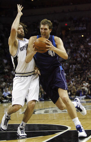 Updated: 2009-02-25 17:19 Dallas Mavericks Dirk Nowitzki (R) drives past San Antonio Spurs Fabricio Oberto during the second half of their NBA basketball game in San Antonio, Texas, February 24, 2009. [Agencies] |