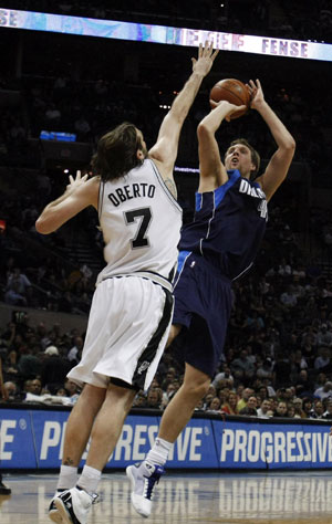 Dallas Mavericks Dirk Nowitzki (R) shoots over San Antonio Spurs Fabricio Oberto during the second half of their NBA basketball game in San Antonio, Texas, February 24, 2009. [Agencies]