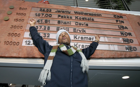 US speedskater Shani Davis celebrates after setting the new world record for the men's 1500m speedskating at the Essent ISU World Cup season finale in Kearns, Utah March 6, 2009. [Xinhua]