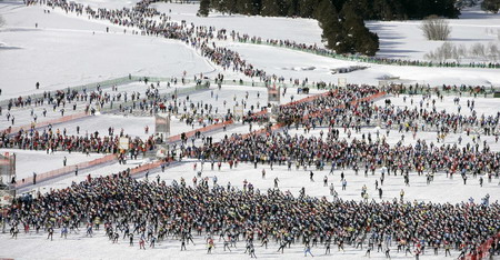 An aerial view shows cross-country skiers climbing a hill during the Engadin Ski Marathon near the village of Maloja March 8, 2009. More than 11,000 skiers participated in the 42.2 km race between Maloja and S-Chanf near the Swiss mountain resort of St. Moritz. [Agencies]