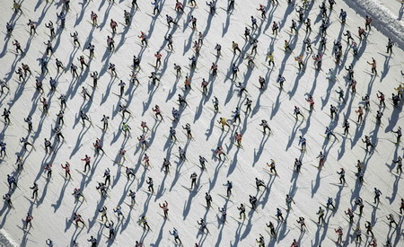 An aerial view shows cross-country skiers climbing a hill during the Engadin Ski Marathon near the village of Maloja March 8, 2009. More than 11,000 skiers participated in the 42.2 km race between Maloja and S-Chanf near the Swiss mountain resort of St. Moritz. [Agencies]