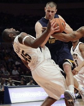 Alex Ruoff added 18 points and Da'Sean Butler had 16 for West Virginia (23-10), which might be the hottest team in the nation's deepest conference. The Mountaineers have won four of their last five, their lone loss coming to No. 5 Louisville last weekend. The tournament's seventh seed got a big assist from DeJuan Blair, the league's co-player of the year, who spent most of the game on the bench for Pittsburgh (27-4). The big man managed only 14 points and five rebounds before fouling out with 1:17 left in the game. Sam Young scored 15 points to lead the Panthers (27-4), whose chances of securing a No. 1 seed in the NCAA tournament took a big hit in what had been a friendly venue. Pittsburgh had advanced to seven of the last eight tournament championships, winning four games in four days last year to capture the title, and was 23-8 at Madison Square Garden since 2001. So much for that. The Mountaineers shot 44.2 percent from the field against one of the league's best defenses, and improved to 17-0 this season when scoring at least 70 points. They advanced to face either No. 3 Connecticut or No. 18 Syracuse on Friday night. Blair got in trouble early, picking up his second foul 4:01 into the game and taking a seat beside coach Jamie Dixon. The 6-foot-7, 265-pound forward didn't return for the rest of the first half, allowing the Mountaineers to slowly build a lead. Levance Fields, whose assist-to-turnover ratio is the best in the nation, kept Pittsburgh close by repeatedly finding open teammates under the basket. The stocky senior guard from Brooklyn hit Young on a soaring alley-oop jam with 7:41 left in the first half, then a couple minutes later made a nifty touch pass to Gilbert Brown cutting to the basket for another easy dunk and a 27-26 lead. Butler, West Virginia's leading scorer, got in his own foul trouble after picking up his third trying to post up on offense with 1:20 left before halftime, prompting a foot-stomping tantrum from coach Bob Huggins in front of the Mountaineers' bench. Butler sat to start the second half, but it didn't slow down the West Virginia offense. Ebanks' highlight slam over the outstretched arm of Jermaine Dixon made it 45-37 just over three minutes in, and a few minutes later Blair picked up a technical foul for shoving Ruoff after a missed shot underneath the Pittsburgh hoop. Ruoff made both free throws, setting West Virginia off on an 8-0 spurt. By the time the senior guard made a layup with 8:59 to go, the Mountaineers led 61-47 and a sizable contingent dressed in yellow was roaring in approval. They maintained the lead the rest of the way, coasting ever closer to the school's first conference championship since 1984, when it was a member of the Atlantic 10. |