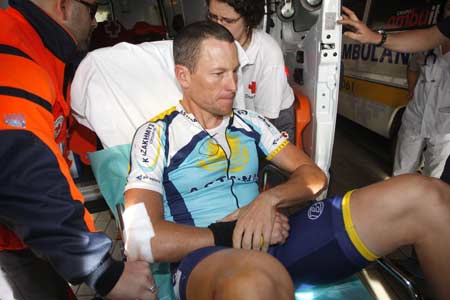 The American was involved in a group fall with several other riders 20 km from the finish in the town of Baltanas, during the first stage of the five-day stage race, which is being held in central Spain. He was riding in Spain to prepare for three-week Tour of Italy (Giro d'Italia) in May and subsequently the Tour de France in July.