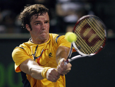 Teimuraz Gabashvili of Russia returns a shot to Rafael Nadal of Spain during their match at the Sony Ericsson Open tennis tournament in Key Biscayne, Florida March 28, 2009. [Agencies]