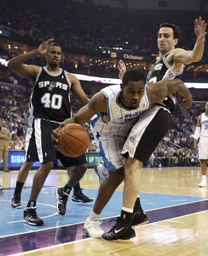 New Orleans Hornets forward Hilton Armstrong (12) is fouled by San Antonio Spurs guard Manu Ginobili (20) during the first half of their NBA basketball game in New Orleans, Louisiana March 29, 2009. New Orleans won the game 90-86. [Xinhua]