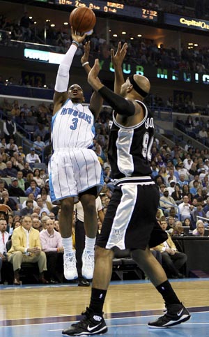 Updated: 2009-03-30 15:32 ![]() New Orleans Hornets guard Chris Paul (3) shoots over San Antonio Spurs forward Drew Gooden (90) during the first half of their NBA basketball game in New Orleans, Louisiana March 29, 2009. [Xinhua]