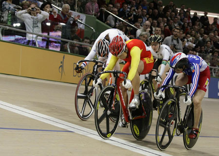 ![]() Winner Guo Shuang of China (C), second placed Clara Sanchez of France (R) and third placed Willy Kanis of the Netherlands (L) cross the finish line at the women's Keirin race at the UCI World Track Cycling Championships in Pruszkow March 29, 2009. [Agencies]