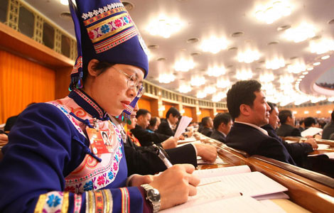 Chen Zhonghe, a NPC deputy from Fujian attends a group meeting of the delegation at China People’s Palace in Beijing, March 5, 2012. [Yan Weijue/chinadaily.com.cn] |