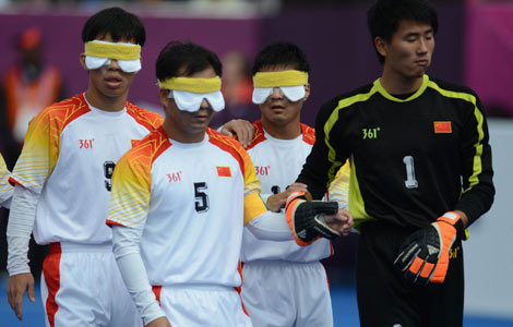 China tied France 0-0 here on Sunday in the London Paralympic football 5-a-side Group B, sharing the top position with defending champions Brazil who crushed Turkey 4-0.