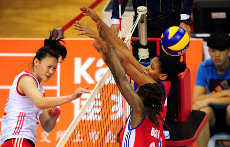 Hui Ruoqi, left, of China spikes against Puerto Rican players during the Shenzhen leg of the 2013 China International Women's Volleyball Tournament in Shenzhen city, Guangdong province, May 23, 2013. The Chinese women's volleyball team overcame a late start Thursday night and fought back to defeat Puerto Rico 3-2 during a thriller. [Photo/icpress.cn]