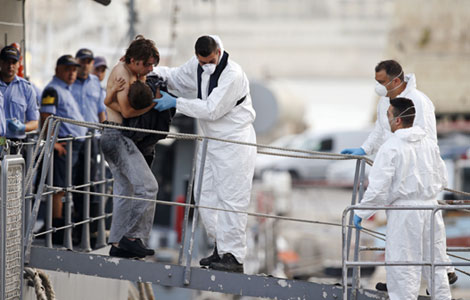 Rafael Nadal of Spain returns a shot during his men's singles tennis match against Stanislas Wawrinka of Switzerland at the Shanghai Masters tennis tournament in Shanghai, Oct 11, 2013. [Photo/Agencies] |