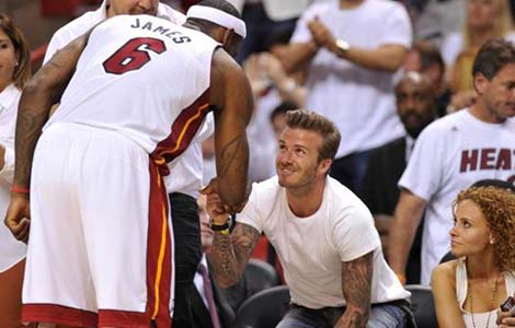 Miami Heat small forward LeBron James (6) greets David Beckham during the second half of Game 7 in their NBA basketball Eastern Conference finals playoff series against the Indiana Pacers in Miami, June 3, 2013. [Photo/Agencies] |