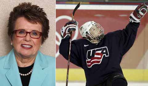 ![]() A combination photo shows former tennis player Billie Jean King (L) posing for a portrait in Beverly Hills, California August 6, 2013 and United States women's hockey team player Caitlin Cahow at practice before the Torino 2006 Winter Olympic Games in Turin, Italy, February 8, 2006.??[Photo/Agencies] |