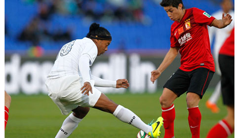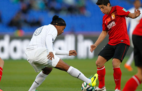 Ronaldinho (L) of Brazil's Atletico Mineiro challenges Dario Conca of China's Guangzhou Evergrande during their 2013 FIFA Club World Cup third place soccer match in Marrakech stadium December 21, 2013. [Photo/Agencies]
