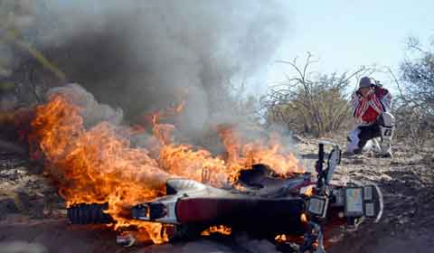 Paulo Goncalves of Portugal reacts in front of his Honda on fire during the fifth stage of the Dakar Rally 2014 from Chilecito to Tucuman, Jan 9, 2014. [Photo/Agencies] |