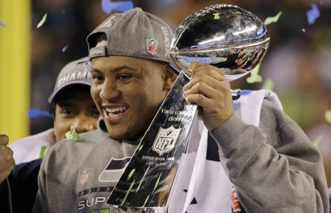 After their look around the New York Giants' clubhouse they will occupy on Super Sunday, the Seahawks took to the field which was ringed by blue and yellow Super Bowl 48 banners. For about 15 minutes, players walked around on the turf and many took pictures and video of the empty stadium.