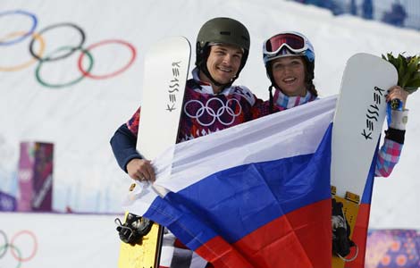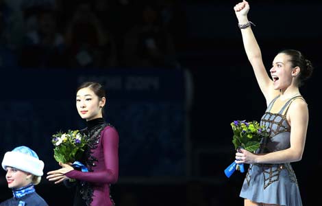Winner Martina Sablikova of the Czech Republic jumps on the podium during the flower ceremony for the women's 5,000m speed skating race at the Adler Arena at the Sochi Winter Olympic Games on Wednesday. Marko Djurica / Reuters |