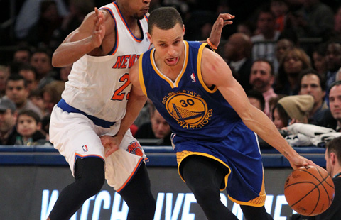 Golden State Warriors point guard Stephen Curry (30) drives to the basket against New York Knicks point guard Raymond Felton (2) in the first half at Madison Square Garden in New York Feb 28 (local time), 2014. [Photo/Agencies] |