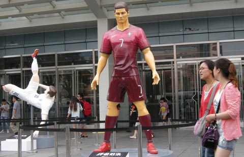 Three statues of World Cup stars greets Beijing fans on Xidan Street on Monday.