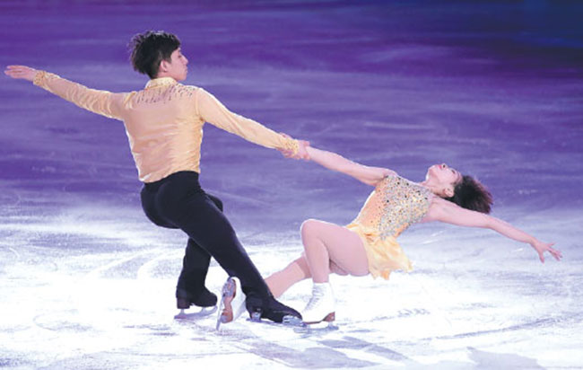 Sui Wenjing and Han Cong perform the World Figure Skating Championships gala finale in Helsinki last month. The Chinese duo won the pairs title. Matikainen / Xinhua
