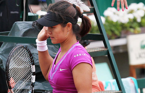 French Open champion Li Na's title defence ended on Monday when she was knocked out in a flurry of errors by Kazakh qualifier Yaroslava Shvedova 3-6 6-2 6-0.