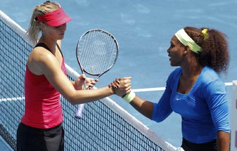 Serena Williams blew away fellow former number one Maria Sharapova 6-1 6-3 to join top seed Victoria Azarenka in the semi-finals at the Madrid Open on Friday.