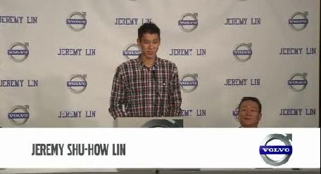 Jeremy Lin announces his endorsement deal with Volvo in a news conference in New York on Monday. Freeman Shen (center), senior vice-president of Volvo Car Corp, and John Maloney, president & CEO Volvo Cars of North America, were in attendance.