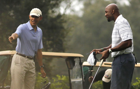 US President Barack Obama stands next to former National Basketball Association player Alonzo Mourning after arriving at the Grande Oaks Golf Club in Fort Lauderdale, Florida, Nov 9, 2013.