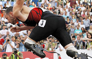 Oscar Pistorius of South Africa runs ahead of Casey Tibbs (R) of the US in the men's 200m T44 final at the National Stadium, also known as the Bird's Nest, during the Beijing 2008 Paralympic Games September 13, 2008.