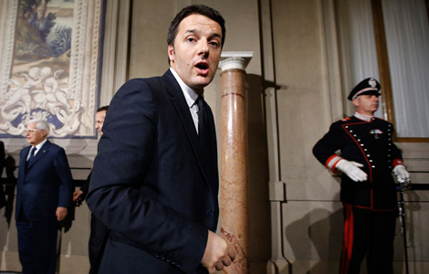 China's Liu Rui(C)delivers the rock while Zang Jialiang(L)and Ba Dexin (R)prepare to sweep the ice during the men's curling semifinal game against Canada at the 2014 Winter Olympics in Sochi, Russia, Feb 19, 2014.[Photo/icpress.cn] |