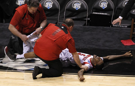 A gruesome injury that left Louisville guard Kevin Ware with a broken leg plunged Lucas Oil Stadium into horrified silence, with coach Rick Pitino wiping away tears and shocked teammates openly weeping during Sunday's Midwest Regional final.