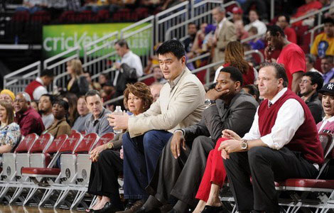 Former Houston Rockets center Yao Ming and his wife Ye Li sit courtside with 22-month-old daughter Amy while watching the Rockets' NBA game against the Dallas Mavericjs at the Toyota Center in Houston.