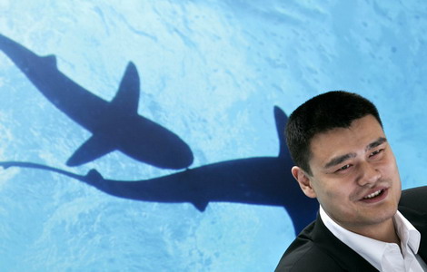 Yao Ming(R), ambassador of shark conservation of the wild aid association under International Union for Conservation of Nature (IUCN) attends a press conference to announce a campaign to protect the endangered species in Shanghai September 22, 2011.