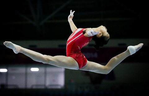 Chinese gymnastics athlete Huang Huidan (R) and Yao Jinnan participate in a training session for the 17th Asian Games at Namdong Gymnasium in Incheon, South Korea, Sept. 18, 2014. The artistic gymnastics competition of the Incheon Asiad will start on Sept 21.
