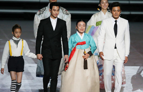 South Korean actor Kim Soo Hyun (second from left) and Jang Dong-gun (first from right) perform at the opening ceremony of the 17th Asian Games in Incheon September 19, 2014.