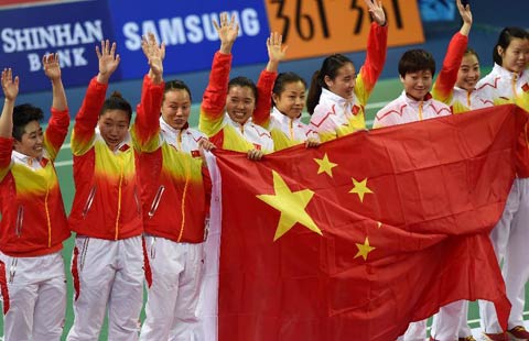 Athletes of China pose on the podium during the awarding ceremony of the women's team match of badminton event at the 17th Asian Games in Incheon, South Korea, Sept. 22, 2014. China defeated South Korea 3-0 and claimed the title.