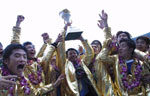 Members of the Guangdong Evergrande Women's Volleyball Club pose for a group photo after winning the AVC Club Volleyball Championship in Dac Lac, Vietnam, on May 5, 2013. [Photo/sports.sina.com] |