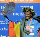 Ethiopian Gebre Gebremariam celebrates with his trophy after the New York City Marathon November 7, 2010.