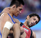 Chinese wrestler Gao Feng lifted his Iranian counterpart S. Ahmadi during their match for the bronze medal in the men's 60kg freestyle wrestling.