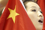 China's former Olympic swimming gold medalist Luo Xuejuan reacts as she watches swimming games during the 14th FINA World championships at the Oriental Sports Center in Shanghai.