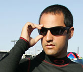 Juan Pablo Montoya of Colombia, surrounded by his crew, heads toward the finish line in his stock car before the ARCA race at the Talladega Superspeedway in Talladega, Alabama October 6, 2006. [Reuters]