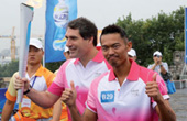 Chinese badminton star Lin Dan runs with the Olympic torch during the relay for the Nanjing Youth Olympic Games in Nanjing, East China's Jiangsu province, Aug 8, 2014.