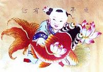 Spring Couplets - Spring couplets are traditionally written with black ink on red paper. They are hung in storefronts in the month before the New Year’s Day, and often stay up for two months. They express best wishes and fortune for the coming year. There is a great variety in the writing of these poetic couplets to fit the situation. A store would generally use couplets hat make references to their line of trade. Couplets that say "Happy New Year" and " Continuing Advancement in Education" are apprpriate for a school. The New Year's Eve - Reunion Dinner A reunion dinner is held on New Year's Eve where members of the family, near and far, get together for celebration. The New Year's Eve dinner is very large and traditionally includes chicken. Fish is included, but not eaten up completely (and the remaining stored overnight), as the Chinese phrase "nian nian you yu", or "every year there is fish/leftover", is a homophone for phrases which could mean "be blessed every year" or "have profit every year", since "yu" is also the pronunciation for "profit". The New Year's Eve celebration was traditionally highlighted with a religious ceremony given in honor of Heaven and Earth, the gods of the household and the family ancestors. First Day of the New Year