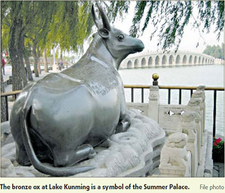 Updated: 2009-01-21 10:06 In Beijing's Summer Palace, a life-sized bronze ox lies on its belly on the eastern bank of Lake Kunming near the bridge with 17 arches. With both its ears pricked up, the elegant animal seems to be admiring the mountains and lake in the imperial garden.