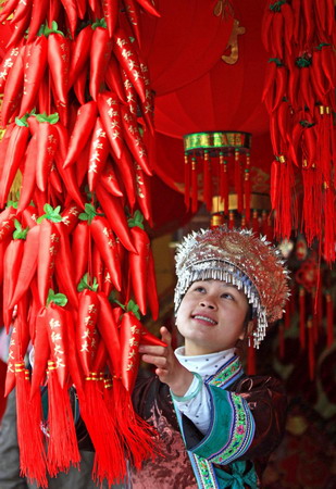 ![]() A Miao minority woman picks up festival decorations for the upcoming Chinese Lunar New Year of Ox in Rongshui County, south China's Guangxi Zhuang Autonomous Region, Saturday, January 24, 2009. [Xinhua]