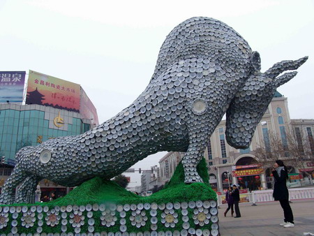 ![]() A giant statue of the ox, made up of porcelain dishes and cups, stands on the street of Jingdezhen city, dubbed the Porcelain Capital, in east China's Jiangxi province Monday January 26, 2009. Spring Festival, or the Chinese Lunar New Year, is the most important traditional Chinese festival that calls for family reunion. It falls on Jan. 26 this year.[Xinhua]