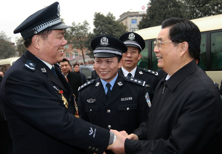 ![]() Chinese President Hu Jintao (R) shakes hands with police officer Qiu Eguo at the Kuaizixiang Police Station in Nanchang, capital of east China's Jiangxi Province, Jan. 26, 2009. Chinese President Hu Jintao visited railway staff members, China Mobile branch workers and police officers on duty and ordinary people in Nanchang Jan. 26, the first day of the Spring Festival, or Chinese traditional lunar New Year, to extend his festival greetings. [Xinhua]