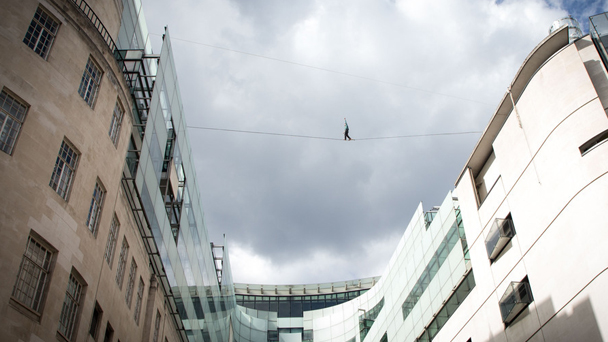 緊張到窒息!英國一男子赤腳高空走鋼絲