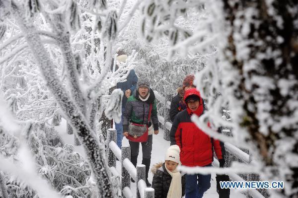 Tourists walk under the rimed trees in Tianmen Mountain of Zhangjiajie scenic resort, central China's Hunan Province, Jan. 3, 2011. (Xinhua/Long Hongtao)